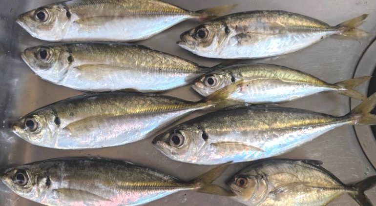 2箇所目、23:30ごろ、やっとアジが釣れた。0時過ぎまでに3匹追加したけど後が続かない。潮止まりか?