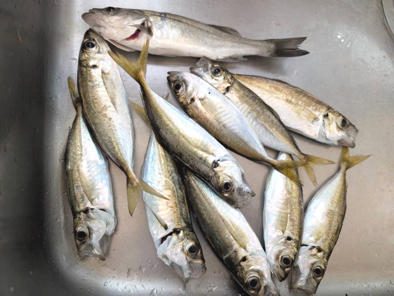 豆アジ抜き上げ時にポロリ7匹にチーバスのエラ洗いにバラシもあったけど近場でも少しは釣れるようだ。