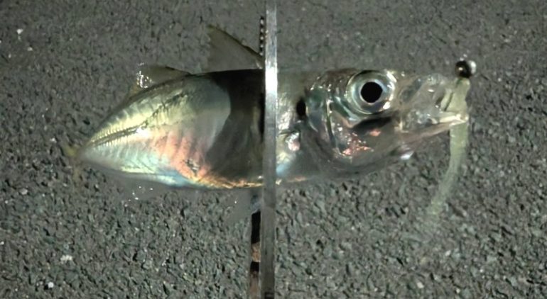 軽量ジグ単では届かないところでバイト音が聞こえていたので少し粘っていたら豆アジがヒットしましたが抜き上げでポロリ。