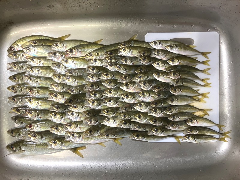 6箇所目は最近通っている場所だけど豆アジばかりしか釣れたことがない。豆アジはポツポツと釣れるが他の場所の状況も見ておきたいので移動。40匹ほど釣れました。