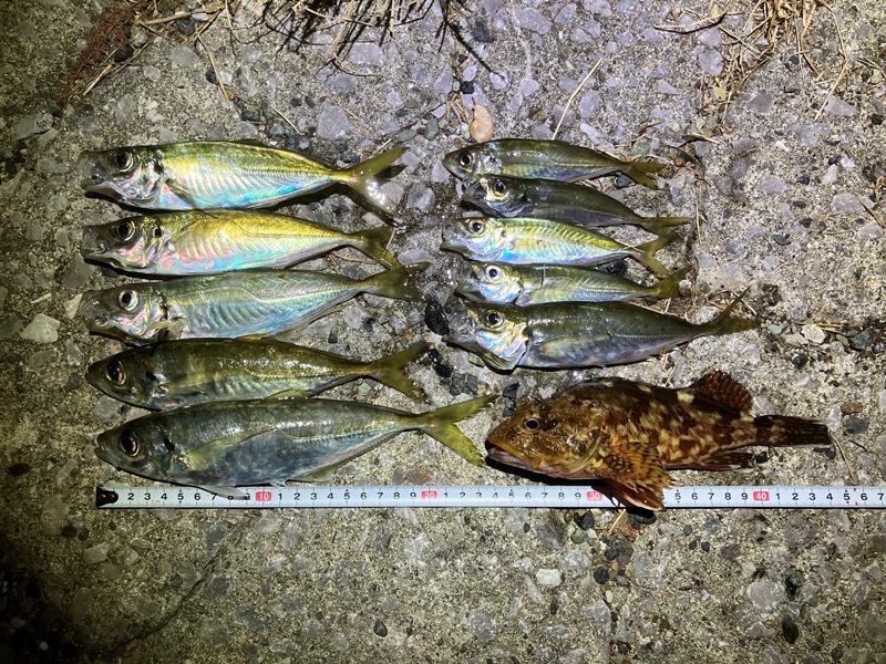 ジグ単に変更するとすぐに豆アジが釣れましたがサイズが伸びず、アタリも減ってきたので移動。アジ10匹、カサゴ1匹。