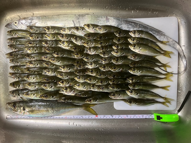 豆アジに混じって、1匹だけ23cmぐらいのが釣れたが釣れるのは豆アジかタチウオばかり、なんとかタチウオも1匹ゲット。