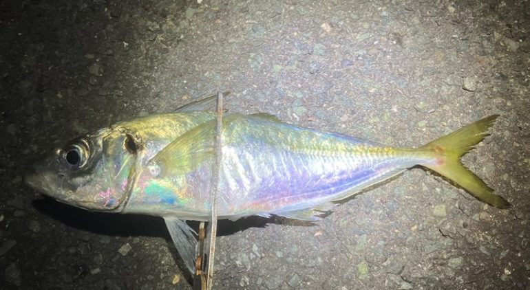 アジにプレッシャーを与えてしまったので遠くの方から探ることにしたら1投目から豆アジ。でも、後が続かず、まだ少ない集団がウロウロしている感じで散発的に釣れる。2時間ほどでアジ30匹。