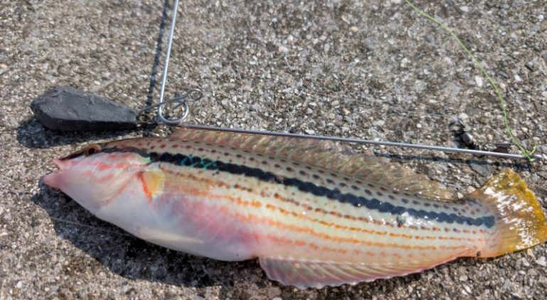 セットできた竿から投げて、3本目を準備していたら最初に投げた竿先が大きく揺れたので巻いてみるとキュウセンでした。シロギスを期待したのに残念。