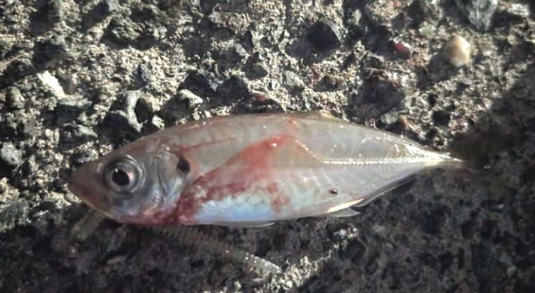 少し離れたところでアジングしてみる。すぐに豆アジ。3匹だけ釣れて、その後釣れなくなった。