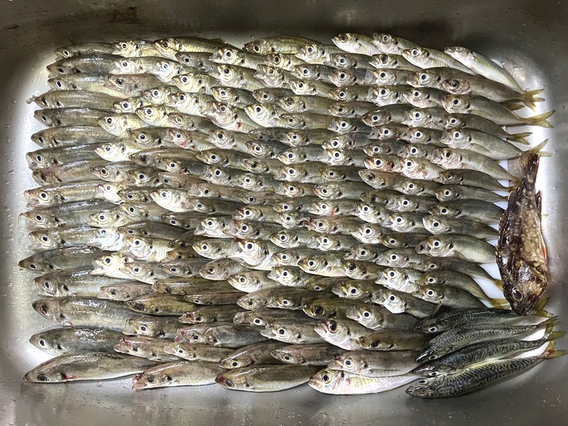 ポツポツ釣れて、1時間半ほどで豆アジ21匹とカサゴ1匹。