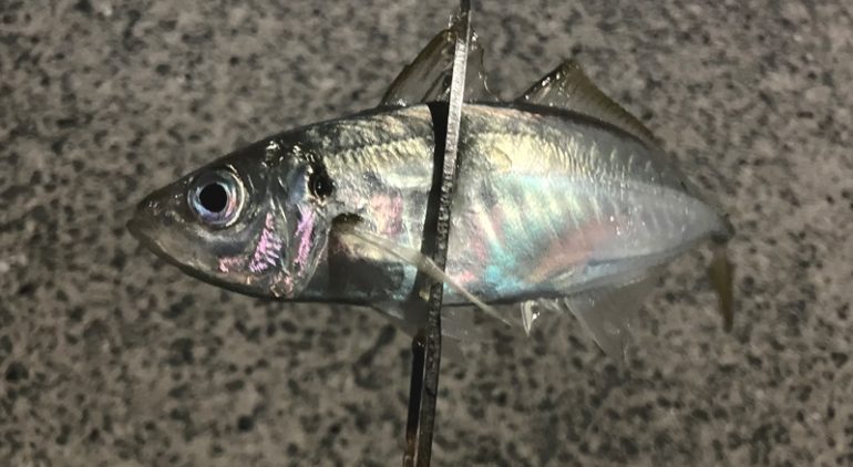 常夜灯下の表層にアジは見えなかったが投げてみると1投目から豆アジ、2投、3投と続く。アタリが少なくなる時間帯もあったがコンスタントに釣れ続いて5時間ほどで結構釣ることができました。
